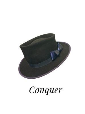 Conquer. For the one who has overcome private battles the world may never fully know. Crafted in rich black wool felt and shaped with a hand shaped teardrop crown, it rises higher than the standard fedora—echoing the inner ascent only the wearer truly understands.